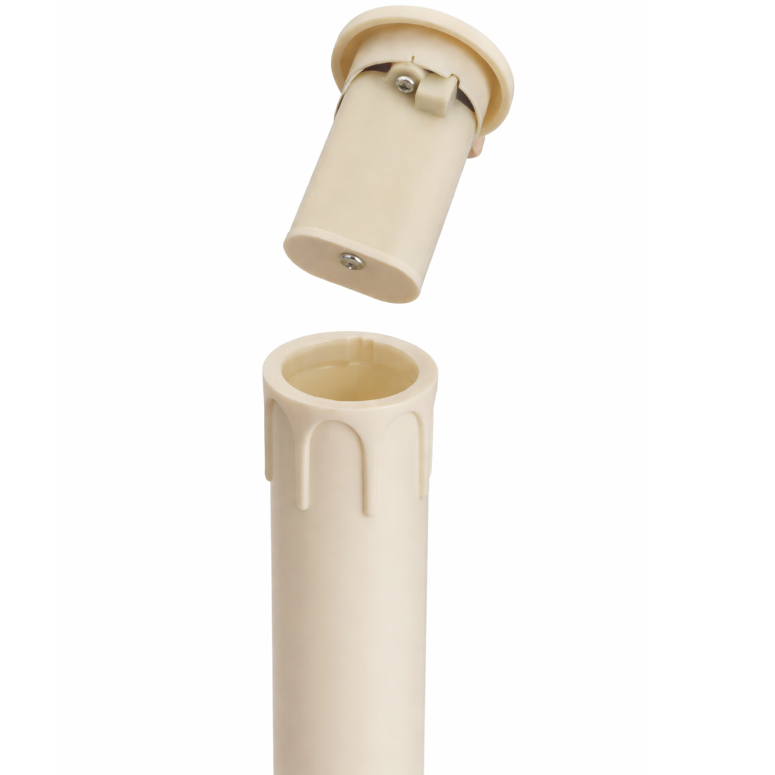 O conjunto de duas velas para procissão a pilhas é um consumível processional formado por um tubo de imitação de cera, uma lâmpada LED e um compartimento para duas pilhas AA.