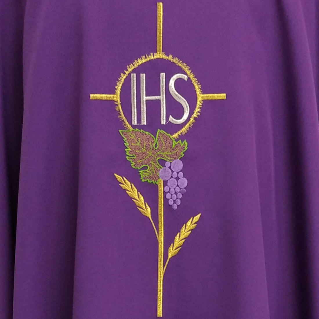 Este modelo de casulla paroquial é um dos mais baratos à venda em nosso catálogo de ornamentos religiosos. Apesar disso, a casulla está bordada na parte dianteira e traseira com vários elementos religiosos:
