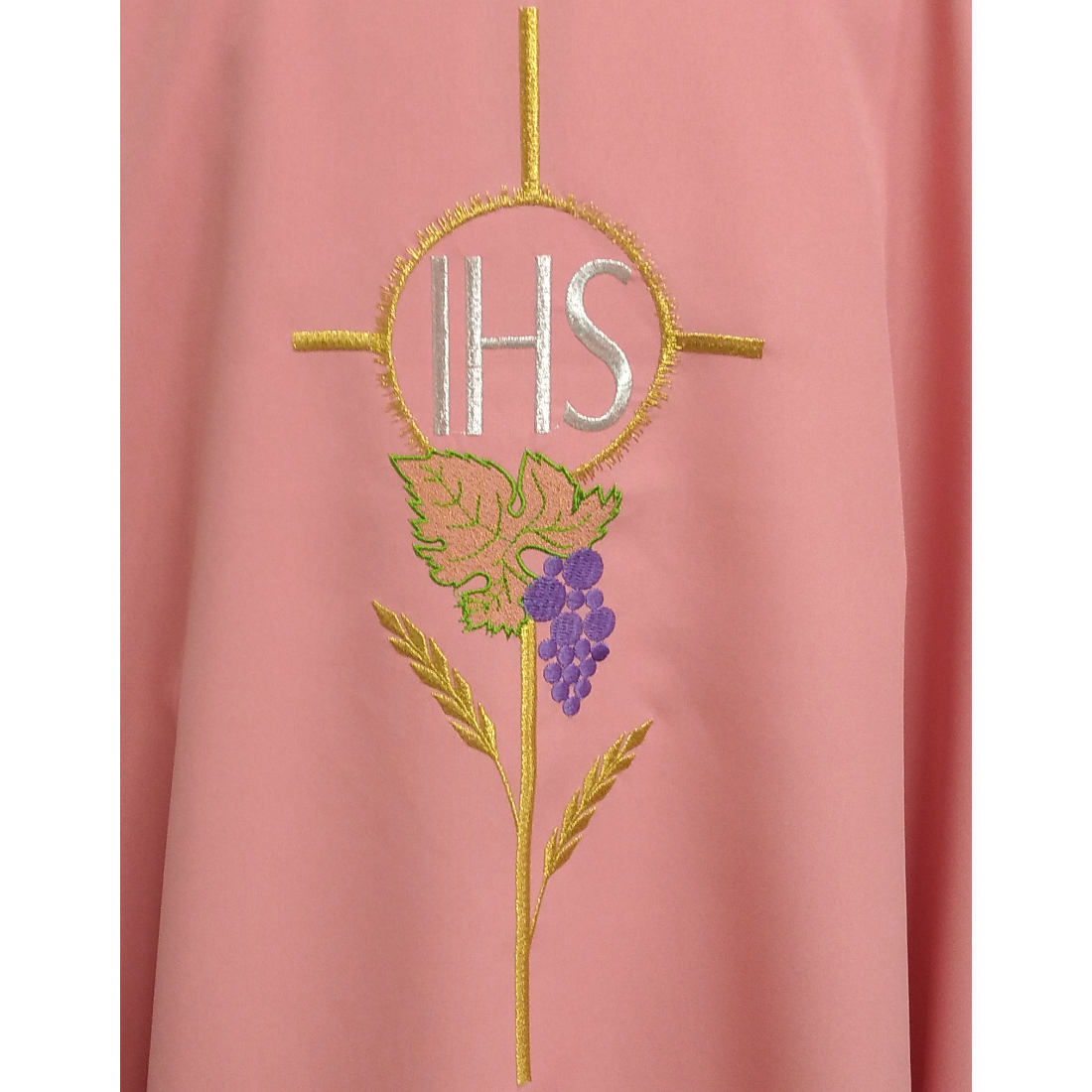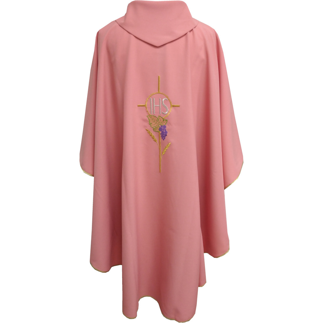 Este modelo de casulla paroquial é um dos mais baratos à venda em nosso catálogo de ornamentos religiosos. Apesar disso, a casulla está bordada na parte dianteira e traseira com vários elementos religiosos: