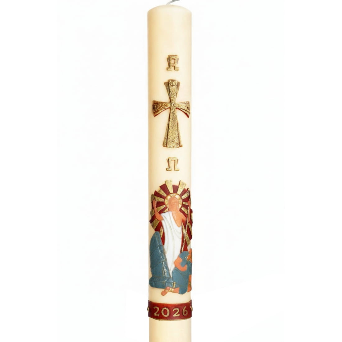 Decoração do Círio Pascal 50: o relevo inclui o Alfa e o Ômega, na cor prata. Entre o Alfa e o Ômega, há uma Cruz. No centro do círio situa-se uma representação de Jesus ressuscitado. Na extremidade inferior do Círio Pascal coloca-se a tira com o ano de 2026.
