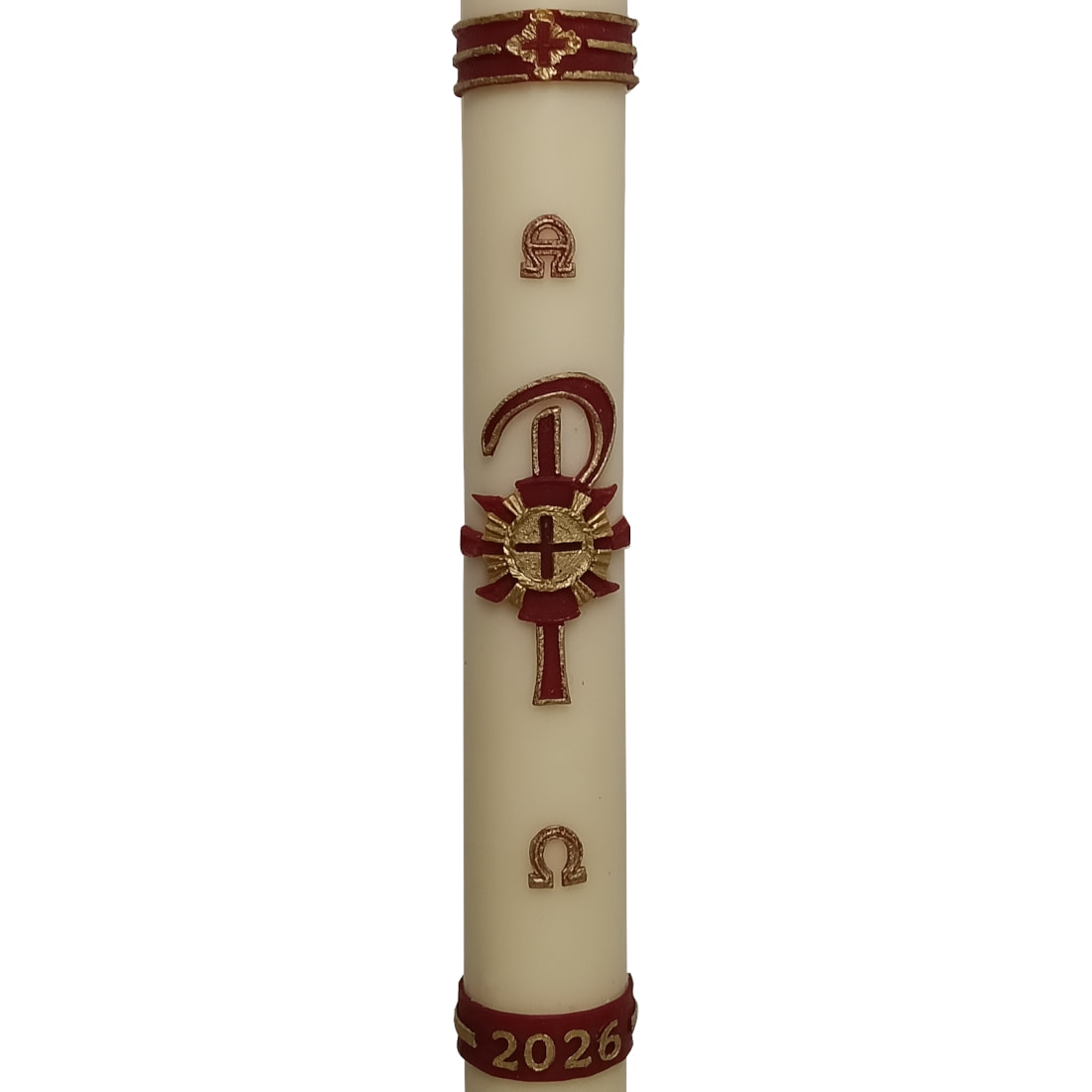 A decoração do Círio Pascal está rematada com uma banda vermelha em relevo que incorpora o ano 2026 em números dourados. Este complemento é facilmente substituível por outros anos para poder utilizar a vela pascal no futuro.