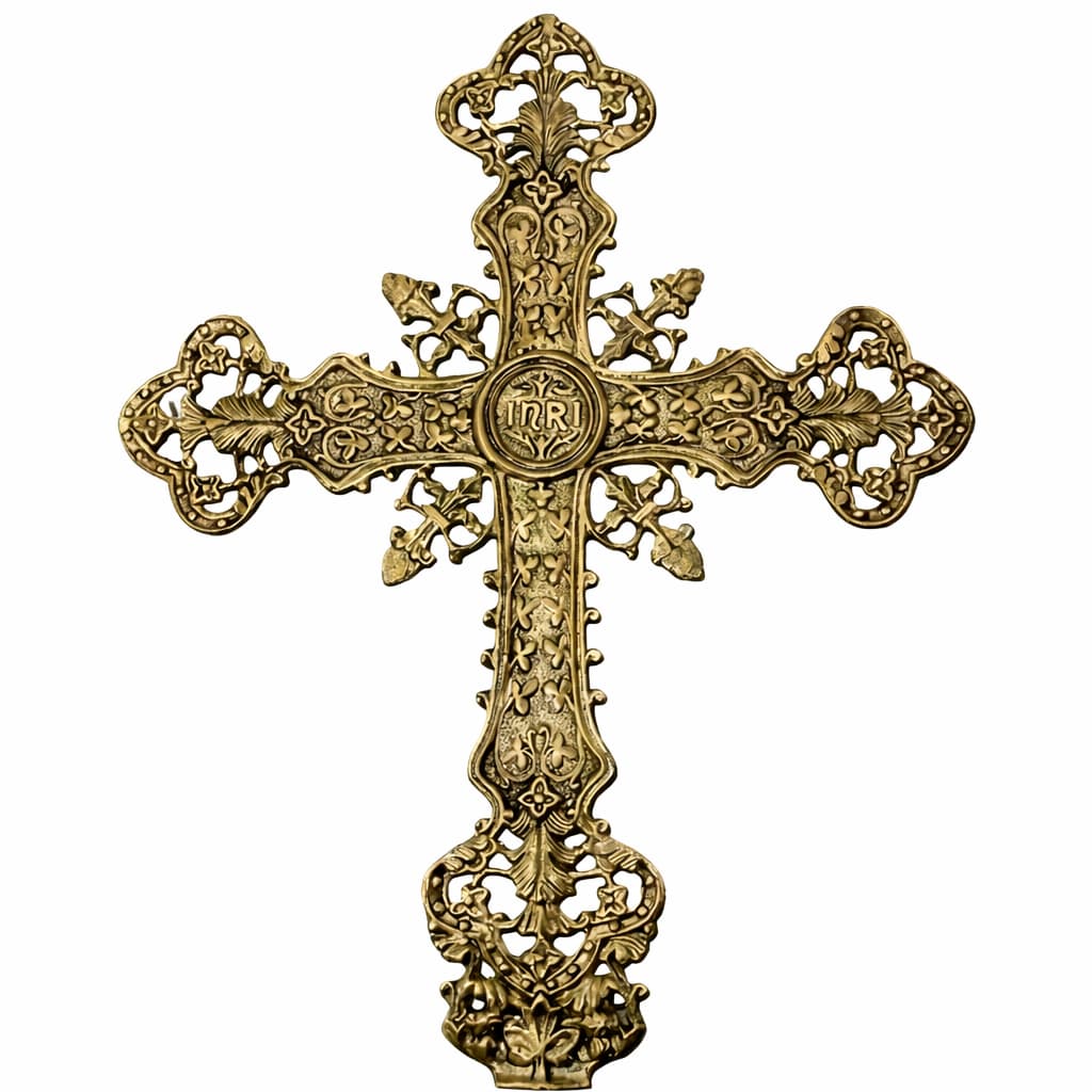 Cruz em bronze com INRI e elementos litúrgicos