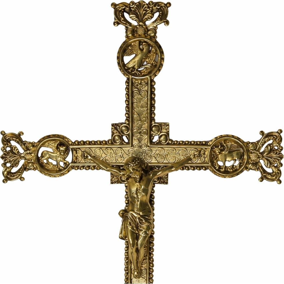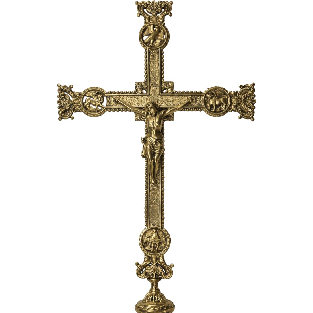 - Cruz paroquial decorada com elementos litúrgicos em relevo.