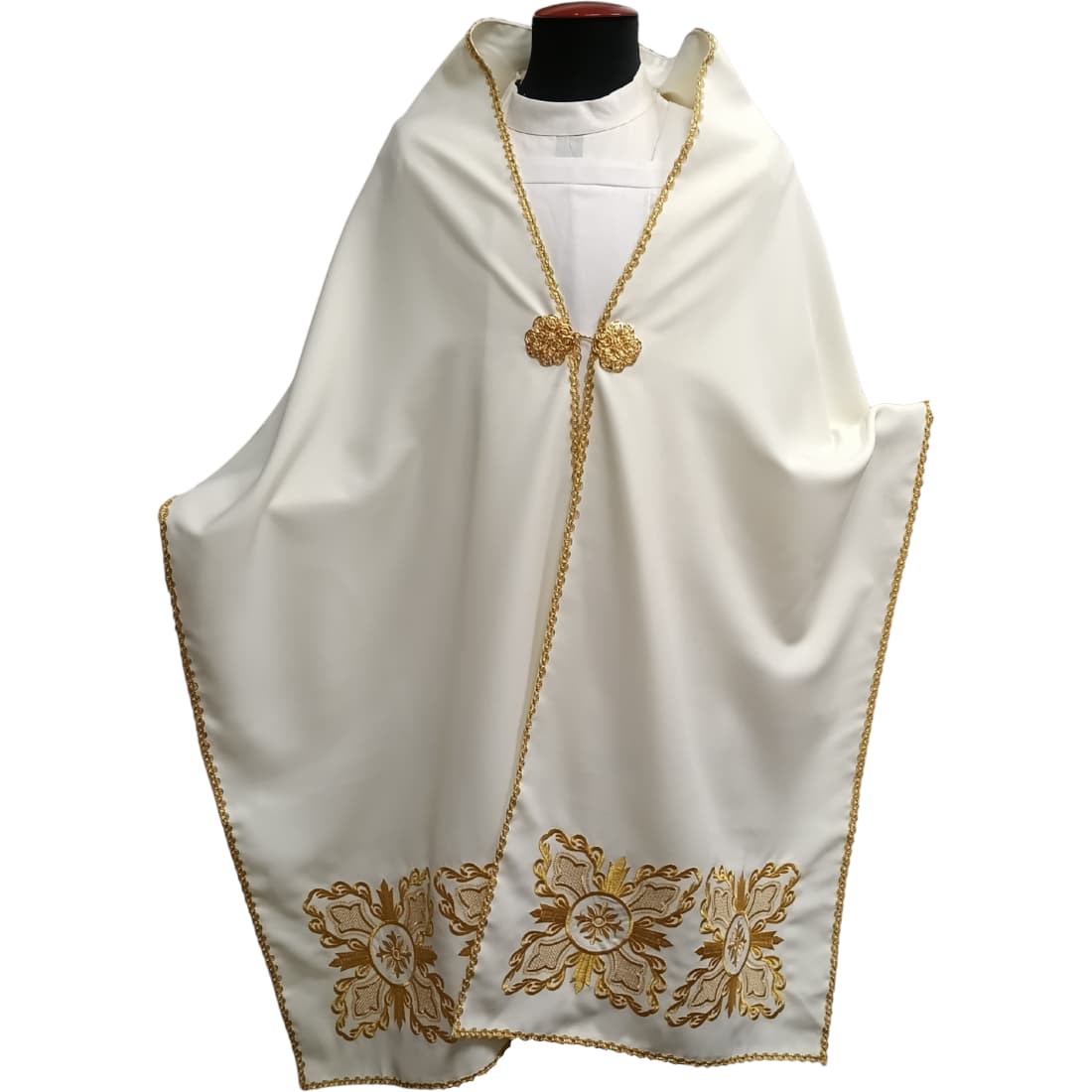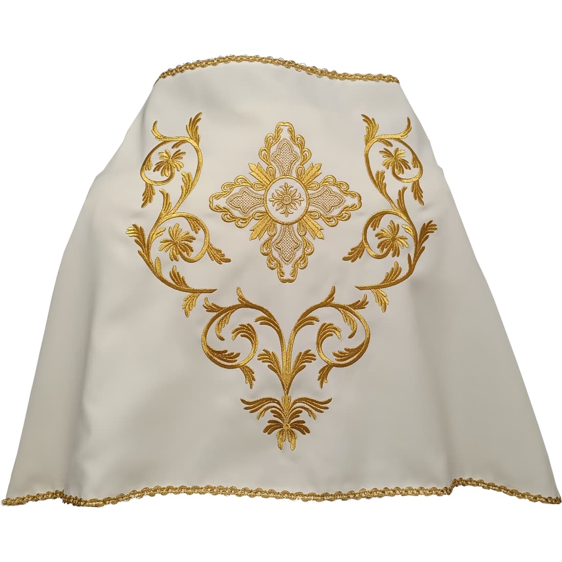 O véu umeral é um pano de ombros sacerdotal que se coloca sobre os ombros e as costas do celebrante para cobrir as mãos ao portar o Santíssimo Sacramento, e em outras celebrações litúrgicas. Confecionado em poliéster e bordado a fio dourado, fixa-se com fecho frontal e mantém a peça estável durante bênçãos e procissões.