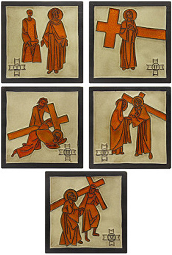 Via Crucis com estações de 14,7 cm de comprimento por 14,7 cm de largura fabricadas em cerâmica. Cada estação tem um marco preto com as imagens em cor dourado sobre fundo branco. Via Crucis composta de quinze estações. Por seu tamanho e preço, é ideal para capelas ou igrejas que não tenham muito espaço disponível para sua localização.